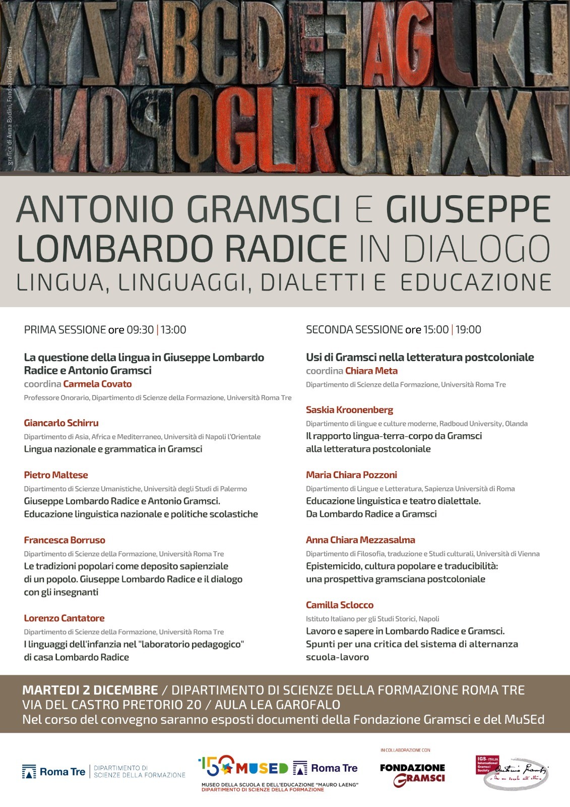 Martedì 2 dicembre 2025, dalle ore 09:30 alle ore 19:00, presso il Dipartimento di Scienze della Formazione (Aula Lea Garofalo _ Via del Castro Pretorio, 20), si terrà il seminario dal titolo "Antonio Gramsci e Giuseppe Lombardo Radice in dialogo. Lingua, linguaggio, dialetti e educazione".