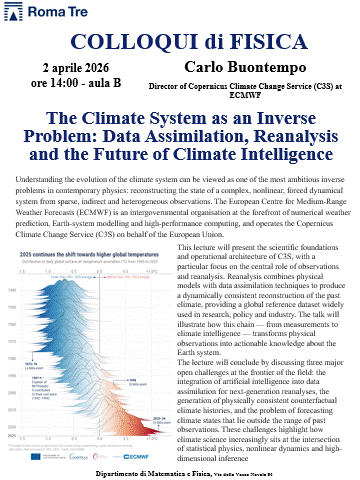 Giovedì 2 aprile 2026 alle ore 14:00, il Prof. Carlo Buontempo Director of Copernicus Climate Change Service (C3S) at ECMWF terrà il Colloquio di Fisica dal titolo "The Climate System as an Inverse Problem: Data Assimilation, Reanalysis and the Future of Climate Intelligence".