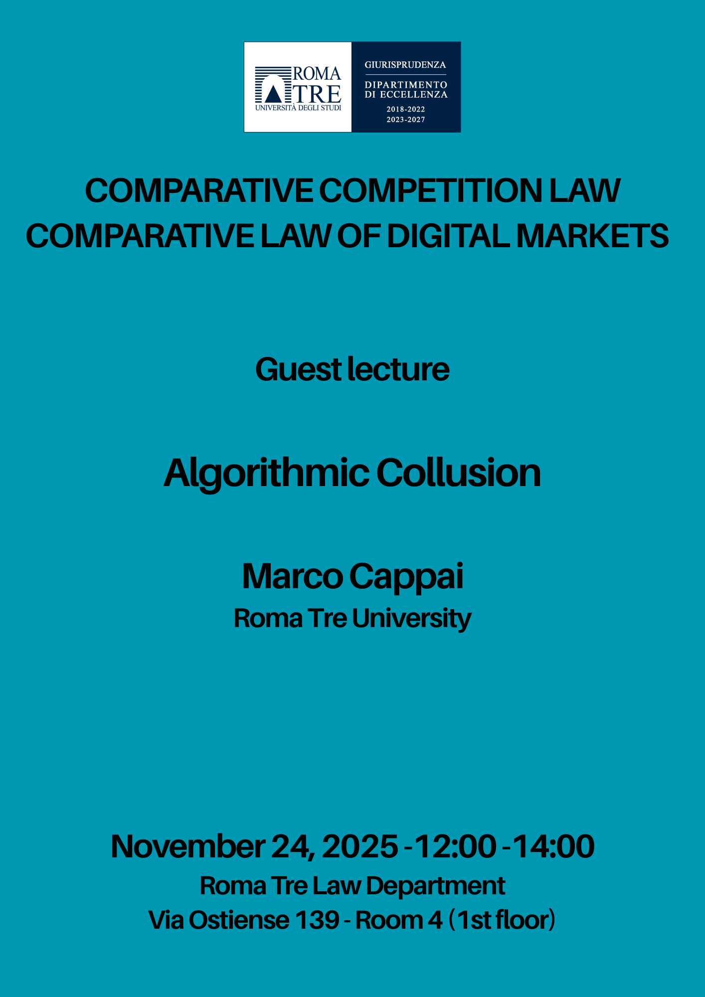 On Monday, 24 November, at 12:00 (Room 4, via Ostiense 139), a guest lecture will be held within the courses of Comparative Competition Law and Comparative Law of Digital Markets, with Dr. Marco Cappai as invited speaker, on the topic: Algorithmic Collusion.