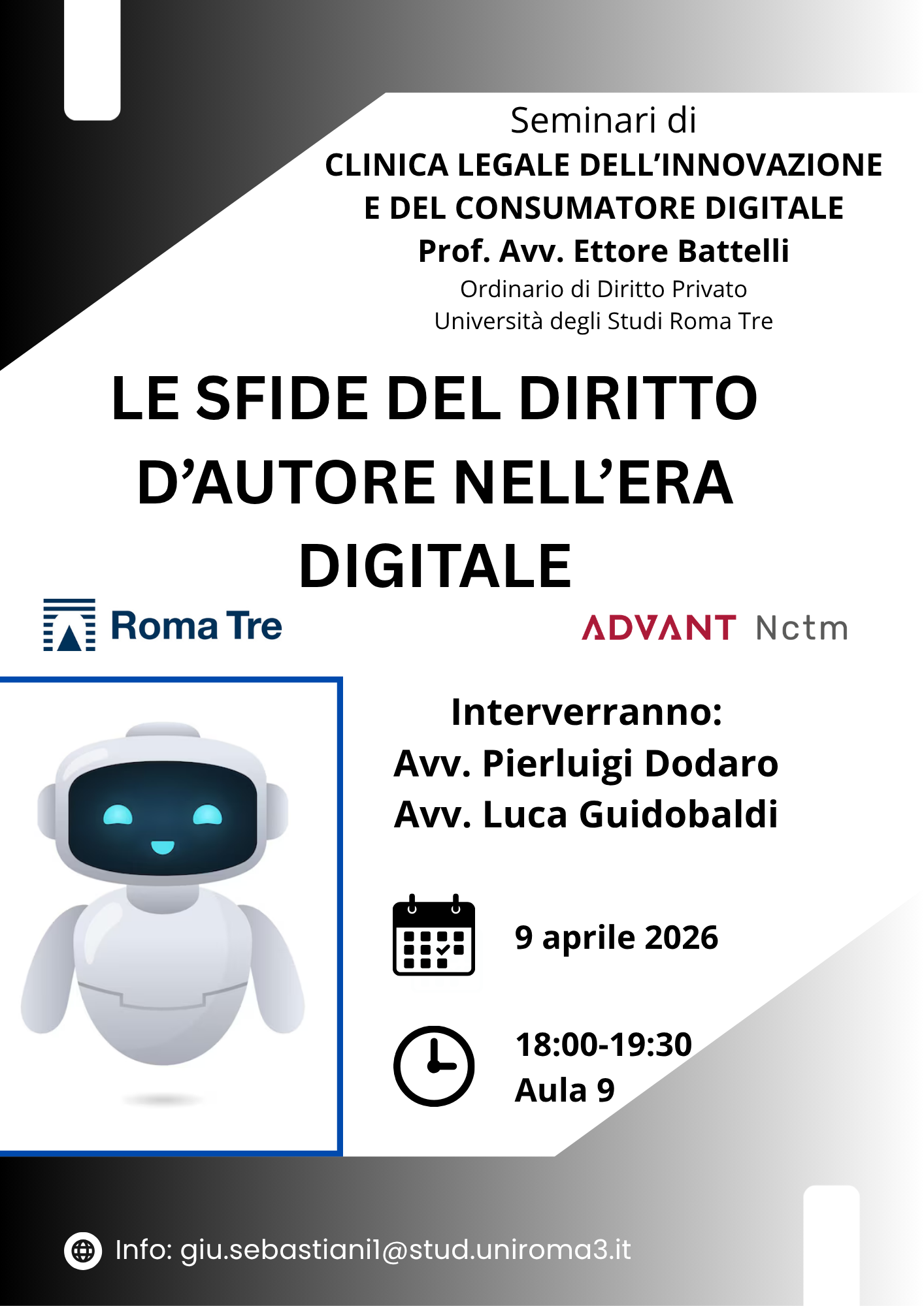 Nell’ambito del corso della Clinica legale in Diritto dell’innovazione e del consumatore digitale, di cui è titolare il Prof. Battelli, si svolgerà in data 9 aprile 2026, alle ore 18, in aula 9, il seminario dal titolo: Le sfide del diritto d’autore nell’era digitale.