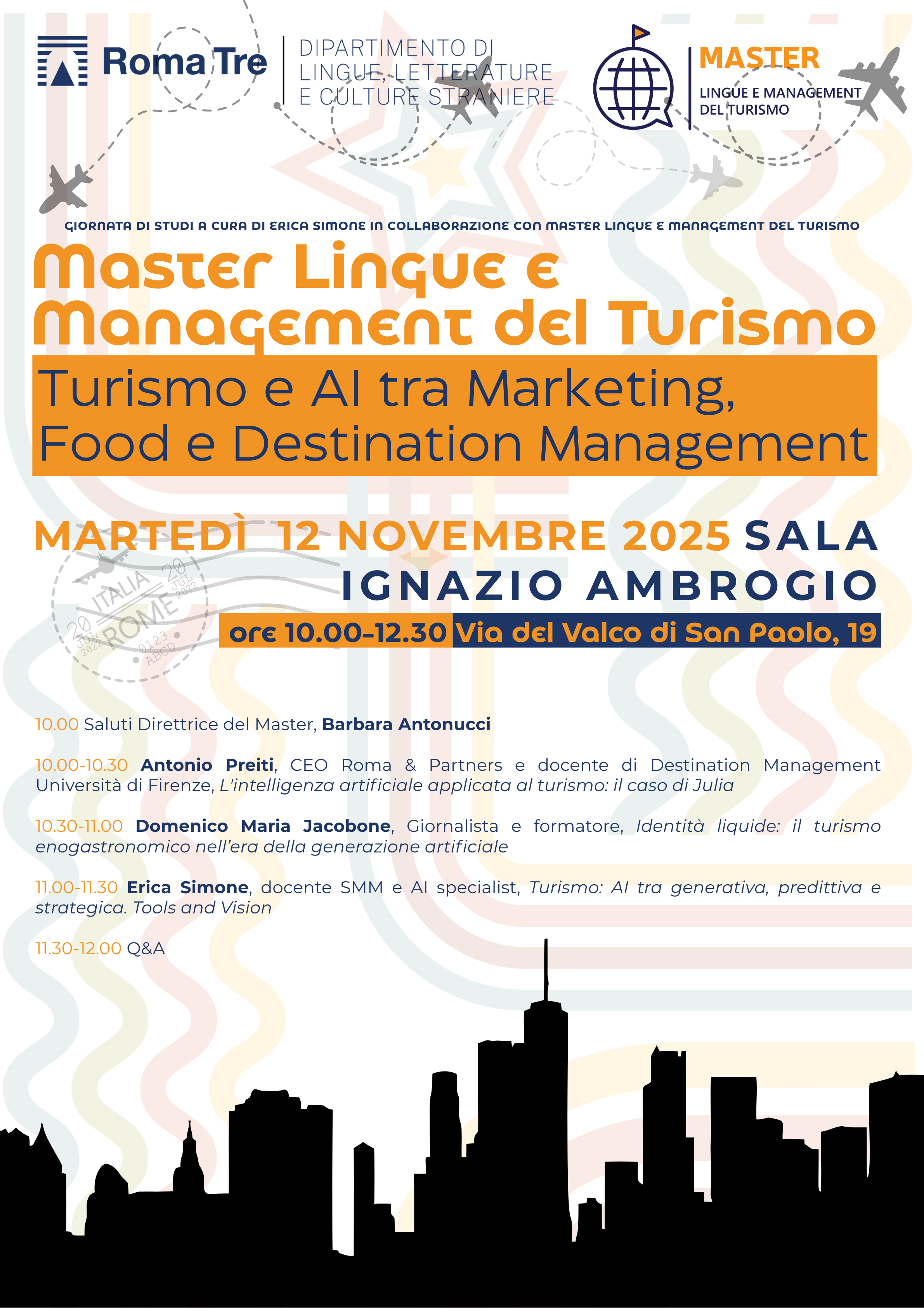 Master Turismo: Al tra Marketing, Food e Destination Management MARTEDÌ 12 NOVEMBRE 202510.00-12.30SALA IGNAZIO AMBROGIO Via del Valco di San Paolo, 19 Link identifier #identifier__129711-1LocandinaLink identifier #identifier__145099-1Link identifier #identifier__130696-2Link identifier #identifier__107713-3Link identifier #identifier__50563-4 Skip back to navigation